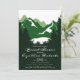 Grüne Berge und Nadelbäume Hochzeit Braudusche Einladung. Ein elegantes Hochzeitsdesign, das eine Bergkette durch Koniferen und Ihren Namen in handgeschriebenem Stil zeigt. Auf der Rückseite befindet sich ein weißes Polka-Punktmuster auf dunkelgrün.
