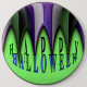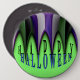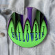 Halloween-Design mit lila und grün gestreiften Bögen, die wie spitze Zähne auf einem Limonen Neonhintergrund aussehen.