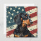 A watercolor portrait of a beautiful black and tan Dachshund Hound Dog is placed against a grunge background of the USA flag. The back of this all occasion flat card has a text field for you to customize.