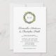 Diese elegante Hochzeitseinladung besticht durch einen Kranz üppiger Vegetation in hellem Olivengrün und dunklem, aquamarinem, weißem Hintergrund. Personalisieren Sie mit Ihrem Monogramm im Kranz.