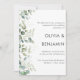Individuelle Hochzeitseinladung. Das grüne Eukalyptus-Blattwerk ist auf einem weißen, sauberen Hintergrund gehalten.