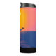 Gruß an die Sonne. Ein Mann ist an einem Strand stehend, der zum offenen Meer hin ausgerichtet ist und die gelbe Sonne mit aufgehauchten Armen salzt.