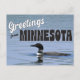 Grüße von Minnesota mit dem Staat Vogel die Gemeinsame Loon schwimmen auf einem See und Grüße in einem Retro-Schriftart.