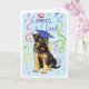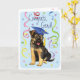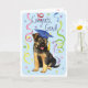 Herzlichen Glückwunsch an Ihren Lieblings-Absolventen mit einem niedlichen, glücklichen deutschen Schäferstudium, das eine Mörtel trägt, inmitten einer Flasche Konfetti.