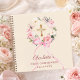 A soft ivory blush background, decorated with watercolored pink and white flowers in a wreath and a golden cross. A pink bow. Personalize and add the name and date.