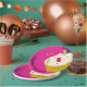 Papierteller mit einem lächelnden gummy Bärenkuchen. Dieses Design hat einen rosa und lila Hintergrund. Dieser Eintrag zeigt die Wörter Happy Birthday und einen anpassbaren Namen.