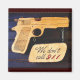 Diese Holzpistole hat das humorvolle Sprichwort "wir nennen nicht 911" , mit einem Holzkornhintergrund, der in Braunerdtönen dargestellt ist, die das Zitat hervorheben. Niedlicher Patriotismus für Küchen- und Einbahnmagnete.