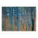 Il s'agit d'oeuvres de Gustav Klimt, Beech Grove 1, 1902. Les oeuvres d'art dépeignent une forêt dense de grands bouleaux, minces, aux troncs pâles marqués par des lignes verticales foncées. Le feuillage est dépeint dans les tons bleu, vert et jaune, ajoutant un sens de profondeur et de vibrations à la scène. Le sol de la forêt est recouvert d'une couche de feuilles orange et marron, créant un contraste saisissant avec les tronçons d'arbres plus légers. La composition globale utilise des techniques pointillistes et impressionnistes, donnant à l'image une apparence vivante et texturée. La verticalité des arbres souligne la structure sereine et rythmique de la forêt.
