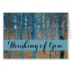 Il s'agit d'oeuvres de Gustav Klimt, Beech Grove 1, 1902. Les oeuvres d'art dépeignent une forêt dense de grands bouleaux, minces, aux troncs pâles marqués par des lignes verticales foncées. Le feuillage est dépeint dans les tons bleu, vert et jaune, ajoutant un sens de profondeur et de vibrations à la scène. Le sol de la forêt est recouvert d'une couche de feuilles orange et marron, créant un contraste saisissant avec les tronçons d'arbres plus légers. La composition globale utilise des techniques pointillistes et impressionnistes, donnant à l'image une apparence vivante et texturée. La verticalité des arbres souligne la structure sereine et rythmique de la forêt.