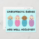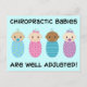 Dieses Design umfasst vier niedliche multikulturelle Babys, Junge und Mädchen, zwei haben sogar Schnuller! Der Text lautet "Chiropraktische Babys sind gut angepasst!"