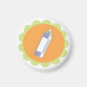 Weißer Magnet mit einer Flasche Haarspray über orange und grünes Design.