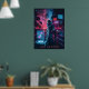 Thema: Futuristische, dystopische Welt inspiriert durch Cyberpunk-Spiele. Central Image: Eine Figur im Cyberpunk-Stil mit High-Tech-Ausrüstung und holografischer Schnittstelle. Hintergrund: Futuristische Stadt mit Neonlicht, fliegenden Autos und digitalen Bildschirmen. Text: "Hack the System" Farben: Neon blau, lila, rot und schwarz.