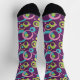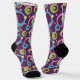 Ein lebendiger lila Hintergrund ist mit einem trendigen Muster von Kreisen, Punkten und Ringen in verschiedenen hellen Farben, darunter Rosa, Grün, Blau und Gelb, geschmückt.