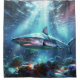 Dieser Duschvorhang hat einen Hai, der darauf abgebildet ist.