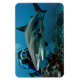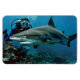 Das Shark and Diver Foto Print wird auf einem flexiblen Magneten eines Tauchers und Haies angezeigt. Foto wird durch KI erzeugt. Lizenziertes Bild