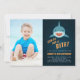 Cooler Hai-Geburtstagsfeier lädt ein lächelnder Hai ein, der in einem dunkelblauen Meer schwimmt und unter dem sich "für einen Biss mitmachen". Personalisieren Sie sich mit den unten stehenden Details zu Ihrer finsteren Geburtstagsparty. Einladungen kehren zu einem passenden Haimuster um. Ideal für Partys am Strand, Partys am Pool und Sommerfeiern, können Sie ein beliebtes Foto des Geburtstagsjungen für eine coole persönliche Touch hinzufügen.