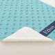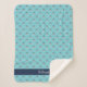 Niedliche Hai-Bettdecke mit einem Muster lächelnder Haie, die in einem blauen Ozean schwimmen. Personalisieren Sie den Namen des Kindes in Weiß auf einem marineblauen Streifen entlang der Unterseite.
