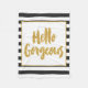 Schöne moderne trendige Schrift-Schrift-Schrift zitieren. "Hallo Gorgeous". Mit einem hübschen vergoldeten Rahmen aus metallischem Glitzer und goldenen Buchstaben mit schwarz-weißen Streifen.