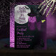 "Hallo Hexen, es ist Party Zeit!" Halloween "Cocktail-Party"-Design mit dem Rücken einer Hexe mit langen, fließenden lila Schlössern und einem lila Kleid und Hexenhut und dem Halten, was wie eine Margarita zu sein scheint, während Fledermäuse um ihren Kopf gegen einen mondbeleuchteten Himmel schwärmen. Ihre vertraute schwarze Katze sieht von unten aus. Zurück zeigt einen Hintergrund für den Glitzer von lila Imitaten. Composite Design von Holiday Hearts Designs.