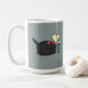 Eine niedliche schwarze Katze mit einer Kaffeetasse und einem Herz