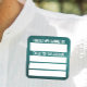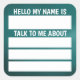 Event Name Tag mit Hallo mein Name ist und "Sprechen Sie mit mir Über" für Business-Netzwerke oder andere Veranstaltungen. Großer Eisbrecher oder Gesprächsstarter. Die Gäste können ihren Namen und ihre Interessen angeben. Aquamarines Hintergrundbild.