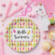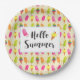Papier Teller mit einem Bild von einem sommerlichen Muster von Popsikeln und Eis in Wasserfarben. Hallo Sommer geschrieben in einem lustigen trendigen Schriftart.