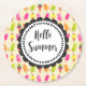 Untersetzer mit einem Bild von einem sommerlichen Muster von Popsikeln und Eis in Aquarellen. Hallo Sommer geschrieben in einem lustigen trendigen Schriftart in einem runden whimsical Rahmen.