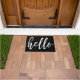 Diese entzückende weiße Skriptfußmatte kennzeichnet das Wort "hallo" in einem modernen handgeschriebenen Skript. Hintergrundfarbe kann durch das Vorwählen einer Farbe von der Palette unter Verwendung des Kundenbezogenheitswerkzeugs geändert werden, oder Sie können Ihren eigenen Hexecode eingeben.