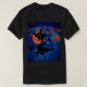 Halloween Hexenkunst, die ihren Besen mit orangefarbenem Halloween-Mond und schwarzer Katze und Text reitet. Dunkelblauer Himmelshintergrund auf schwarzem Shirt.