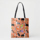 Niedliche Halloween-Hunde aus Australien in spitzigen Kostümen. Aussie Hunde mit verschiedenen Fellfarben halten Trick-oder-Leckerei Kürbis, tragen Hexenhüte und Pullover mit verstreuten Fledermäusen, Pfoten und Hundeknochen.