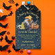 Halloween niedliches Baby Geist Kürbis Brautopf Babydusche Gefallen Geschenk Dankeschön Tags. Ein niedlicher Baby Kürbis-Geist mit Katzenkuschel, Pilz und einer großen Topfwasserfarbe auf dunkelsternigem Hintergrund für Halloween-Babydusche.