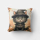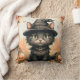 Pumpkins umgeben ein niedliches schwarzes Kätzchen in einem Hintergrund, der Halloween-Thema ist.