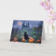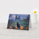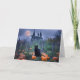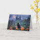 Ein klassisches Halloween-Bild einer schönen schwarzen Katze, mit gelben Augen in einem Kürbisfleck. In der Ferne ist eine alte Viktorianische oder gotische Zuhause mit Fledermäusen. Alles was drinnen steht, ist Happy Halloween! Da weniger manchmal mehr ist, aber man kann das Innere zu allem ändern, was man will.