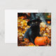 Karte mit einer hübschen schwarzen Katze, die einen Hexenhut trägt! Diese kleine Süsse Posen mit einem Kürbis. Der Herbst hinterlässt Teppich auf dem Waldboden. Ein puristisches Geschenk für Halloween-Feiern!