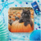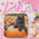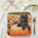 Eine flauschige, schwarze Erholung auf einem großen orangefarbenen Kürbis, umgeben von einem Kürbispflaster, der mit farbigen Kürbissen gefüllt ist