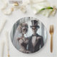 Eine Skelettbräune und ein Bräutigam in Hochzeitskleidung mit Blumenzubehör und einem Set mit Top-Hut vor einer scheußlichen Waldlandschaft