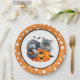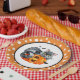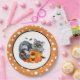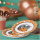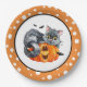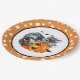 Die Papiertafel aus Halloween-Party wird in einem Polka-Dots-Design mit einer Katze auf Kürbisdruck gezeigt. Passen Sie dieses Objekt an oder kaufen Sie, wie es ist. In 9" Größe angezeigt. Verkauft in Paket mit acht. Wir bieten auch passende Papierservietten an. Börsenbild freepik.com