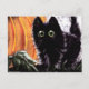 Carte postale avec un mignon petit chat noir effrayé avec de grands yeux verts debout à côté d'un citrouille. Purrfect pour les salutations d'Halloween ! Who Dat Scaredy Cat de l'artiste Michaeline McDonald. Commandez un portrait de chat effrayé de votre chat à www.wisetailsart.com .