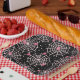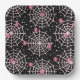 Papier Teller mit niedlichem, nahtlosen Muster mit weißen Spinnweben und rosa Spinnen.