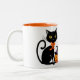 Die Tasse des Kaffees wird in einem festlichen Halloween-Katzenjammer und Hexenkürbisprint gezeigt. Passen Sie dieses Objekt an und wählen Sie eine andere Tasse oder kaufen Sie, wie es ist.