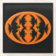 Dieser phantastische Untersetzer aus Glas weist ein Oval in Orange mit sechs Krähen auf. Jede Krähe hat gelbe Augen mit schwarzen Schülern und ausgestreckten Flügeln. Die Krähen fliegen einander entgegen und bilden eine ovale Form. Der Hintergrund ist schwarz.