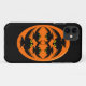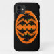 Dieses phantastische iPhone-Gehäuse ist in einem orangefarbenen Oval mit sechs Krähen untergebracht. Jede Krähe hat gelbe Augen mit schwarzen Schülern und ausgestreckten Flügeln. Die Krähen fliegen einander entgegen und bilden eine ovale Form. Der Hintergrund ist schwarz.