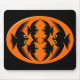 Dieses wunderschöne Halloween-Mousepad hat ein orangefarbenes Oval mit sechs Krähen. Jede Krähe hat gelbe Augen mit schwarzen Schülern und ausgestreckten Flügeln. Die Krähen fliegen einander entgegen und bilden eine ovale Form. Der Hintergrund ist schwarz.
