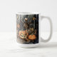 Jack-o-Laternen sehen aus, als drei Skelette vor einem Spuk Haus auf dieser niedlichen und lustigen Halloween-Tasse tanzen.