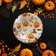 Halloween-Gespenster, Jack-o-Laternen, Hexenhüte und Bonbons auf orangefarbenem Hintergrund.