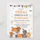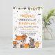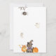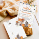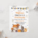 Die Einladung umfasst niedliche Gespenster, Fledermäuse, Kürbis und eine Katze mit Bannern und Sternen im Hintergrund. Dieses Design ist perfekt für eine Geburtstagsfeier im Halloween-Stil.