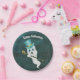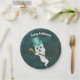 Diese Papierplatte hat einen extravaganten weißen Geist, der in einem Sternenhimmel mit blauem Oberhut schwebt und einen schwarz-goldenen Stock mit einem goldenen Schädel trägt. Passen Sie den glücklichen Halloween-Text mit der Vorlage an.