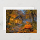 A mysterious Halloween cottage deep in the forest, with an old wooden house glowing in the dusk and a curious fox watching from the shadows.