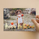 Niedliche und moderne Halloween-Fotokarte mit "Happy Halloween" in handgeschriebenem Goldfolienskript. Personalisieren Sie die Halloween-Goldkarte mit Ihrem horizontalen Foto und Familiennamen. Die Rückseite der Karte zeigt ein geometrisches Schwarz-Weiß-Muster, das eine spielerische, aber stilvolle Touch verleiht. Ideal, um während der Sportsaison festliche Grüße an Freunde, Familie und Liebste zu senden.
