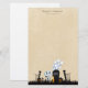 Lustiges Büropapier mit einem niedlichen Halloween-Design. Set in einem dunklen und beängstigenden Friedhof. Ein Grabstein sagt RIP, mit einer Kerze und ein paar leuchtenden Schädeln auf dem Boden. Ein alter, cremiger Zaun lehnt sich zur Seite ab. Ein bezauberndes, lächelndes Skelett winkt und einige cool aussehende Geister schwingen in der Luft herum. Set auf einem cremefarbenen Pergament. Personalisieren Sie Ihre Daten mit einem Namen oder einem anderen Text.